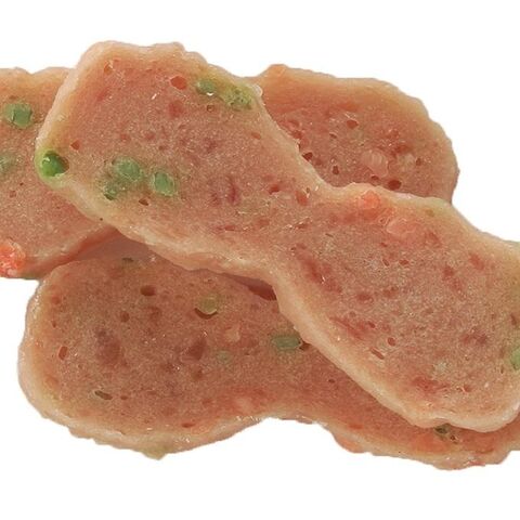 鶏肉(胸肉、ササミ)、小麦粉、にんじん、ほうれん草、ソルビトール、グリセリン、プロピレングリコール、ミネラル類(ナトリウム)、リン酸塩(Na)、酸化防止剤(ビタミンE)、発色剤(亜硝酸ナトリウム)、食用色素(赤102、赤106、黄4、黄5、青1)