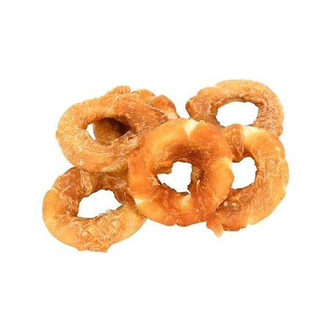 ◆ドーナツ状のガムに鶏むね肉を巻き付けて仕上げました。