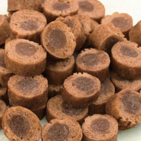 ■原材料:肉類(牛肉、牛レバー、鶏ササミ、鶏胸肉、鶏肉)、小麦粉、糖類、コーンスターチ、タピオカでん粉、コラーゲンペプチド、軟骨抽出物(コンドロイチン含有)、グリセリン、トレハロース、ソルビトール、膨張剤、リン酸塩(Na、K)、着色料(カラメル、クチナシ)、ミネラル類(ナトリウム)、グルコサミン