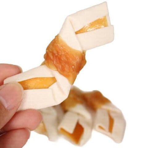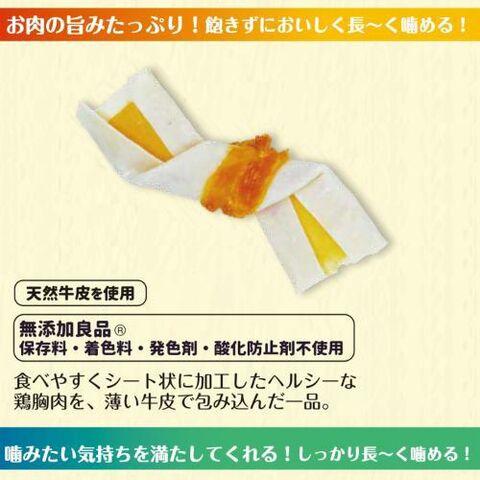 ◆厚みのある骨型ガムに慣れていないコも食べやすいよう、薄い牛皮を使用し、シート状に加工したヘルシーな鶏むね肉を包み込みました。