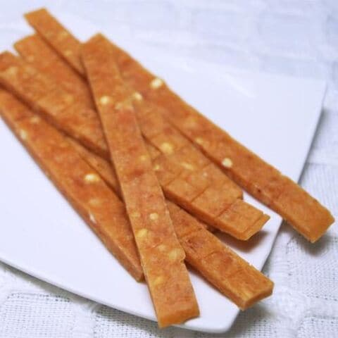 ■原材料:鶏肉(胸肉、ササミ)、コーンスターチ、チーズ、ソルビトール、グリセリン、pH調整剤、プロピレングリコール、ミネラル類(ナトリウム)、リン酸塩(Na)、酸化防止剤(ビタミンC)、発色剤(亜硝酸ナトリウム)、セルロース、調味料、着色料(赤102、黄5)