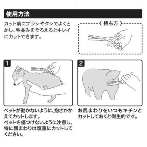 ◆被毛をすいて、量を調節します。切りやすく、刃先が丸い安心形状。