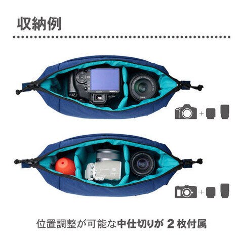 標準レンズ付き小型一眼レフカメラと交換レンズ1本、もしくはミラーレスカメラと交換レンズ1本~2本の収納が可能です。