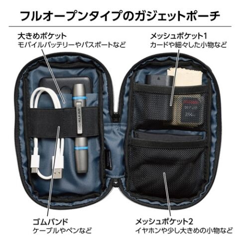 収納物が出し入れしやすく一目で確認でき、ガジェットポーチとして使いやすいデザインです。