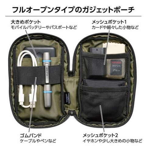 収納物が出し入れしやすく一目で確認でき、ガジェットポーチとして使いやすいデザインです。