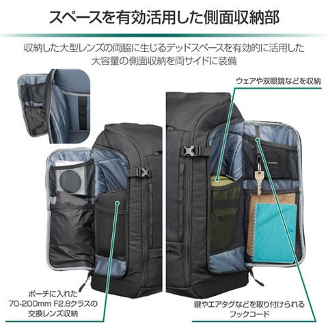 精密で高価な大型レンズを運搬するためにデザインされたメイン収納部には、300mm F2.8クラスの超望遠レンズを装着したプロ用一眼カメラをフード順付でそのまま収納可能。