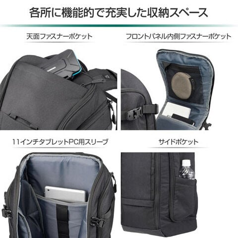 内部背面側には11インチ程度のタブレットPC用スリーブがあり、バッグ両側面には、ドリンクボトルなどが収納でき、