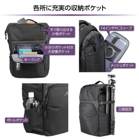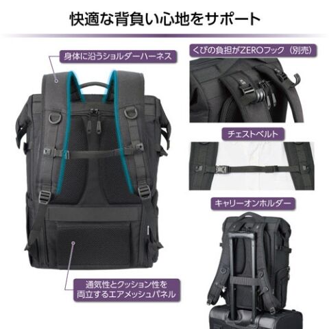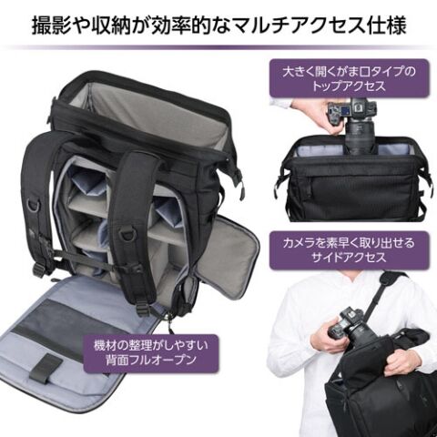 超望遠レンズを付けたカメラも取り出し易い大きく開く上部開口部に加え、フルオープンで収納物を一目で確認でき、機材の整理がしやすい背面開口部、左手側の側面にはバッグを下ろさずにカメラを素早く取り出せるサイドアクセスも搭載したマルチアクセス仕様です。