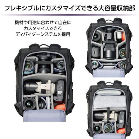 2台のカメラをトップとサイドから素早く取り出せるレイアウトや、150-600mmクラスの超望遠レンズを装着したカメラの収納、上下2気室に機材と衣類を分けて収納するなど、撮影用途に応じた柔軟なレイアウト変更が可能です。