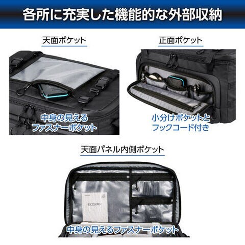 カメラは、L字型フラップ式の仕切りでレンズを下向きに収納することで、取り出しやすさとバッグ内の安定性を向上させます。
