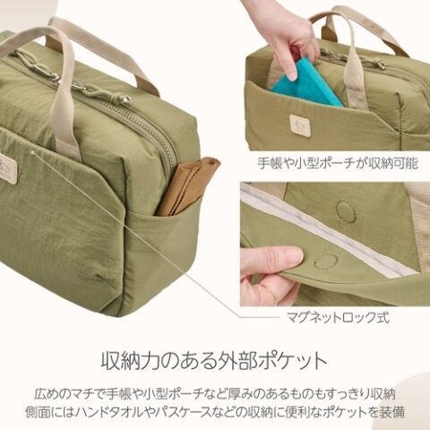 側面にはハンドタオルやパスケースなどの収納に便利なポケットを備えています。