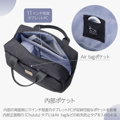 また、内部正面側にある「Chululu」タグは、AirTagなどの紛失防止タグを入れられる隠しポケットになっています。