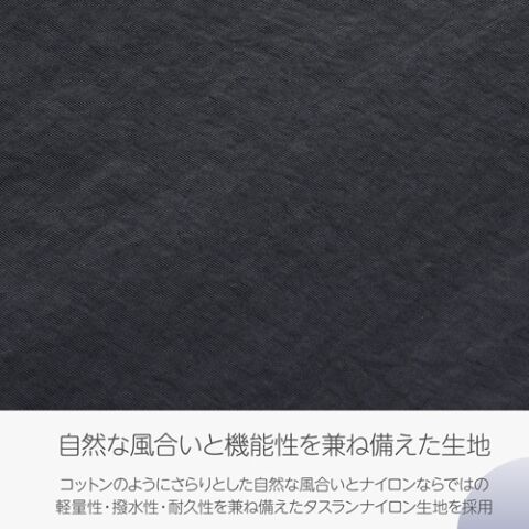 コットンのようにさらりとした自然な風合いと、ナイロンならではの軽量性・撥水性・耐久性を兼ね備えたタスランナイロン生地を使用しています。