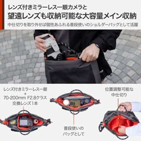 メイン収納部は、レンズ付きミラーレス一眼カメラと70-200mm F2.8クラスの交換レンズ1本などの収納が可能な十分な容量を備えています。