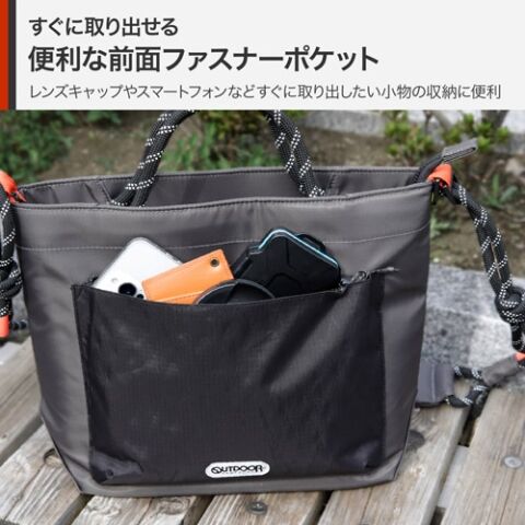 バッグの前面には、レンズキャップやスマートフォンなど、すぐに取り出したい小物の収納に便利なファスナーポケットが付いています。