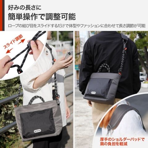ロープの結び目を軽くつまんでスライドさせるだけの簡単操作で、持ち方やファッションに合わせて自由にお好みの長さに調節できます。