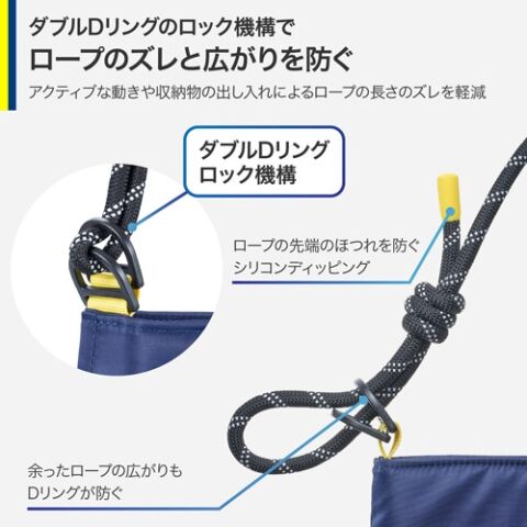 アクティブな動きや収納物の出し入れによるロープの長さのズレを軽減します