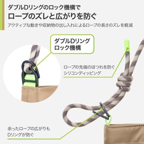 アクティブな動きや収納物の出し入れによるロープの長さのズレを軽減します