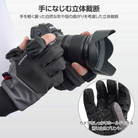 カメラのボタン操作や細かい作業も快適に行え、手とグローブの間に隙間ができにくいため、保温効果も高まります。