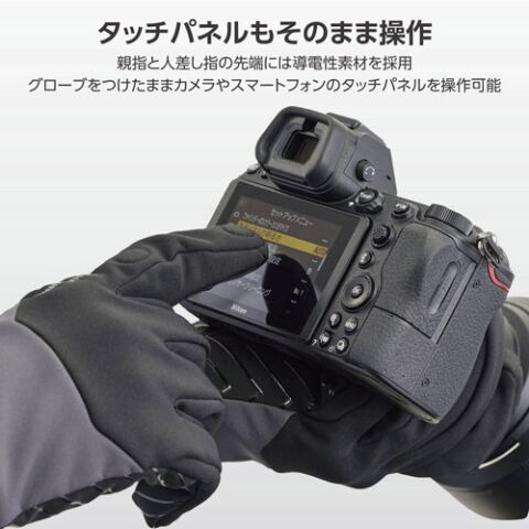 親指と人差し指の先端には導電性素材を使用しているため、グローブをつけたままカメラやスマートフォンのタッチパネルを操作できます。