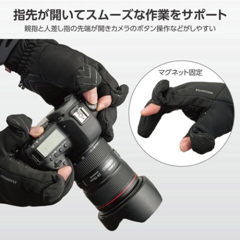 カメラのボタン操作や細かい作業も快適に行え、手とグローブの間に隙間ができにくいため、保温効果も高まります。