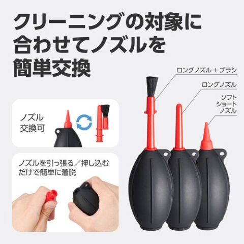先端までソフトなシリコン素材のショートノズルは、清掃中に機材と接触しても傷をつけにくく、大切なカメラやOA機器にも安心して使用できます。