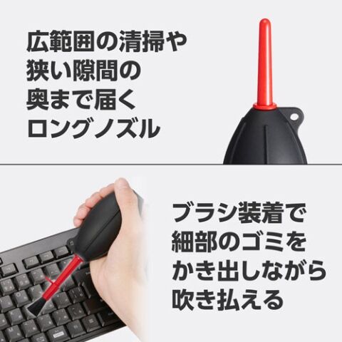 ブロアーの先端を細かくコントロールできるので、カメラボディの溝、レンズマウントの接点、PCキーボードの隙間など、細部のホコリやゴミを的確に吹き飛ばします。