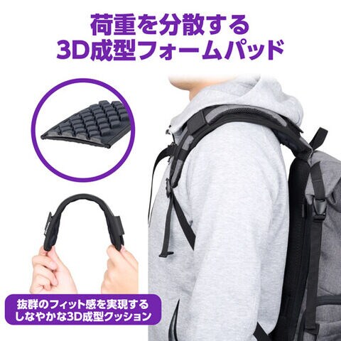 抜群のフィット感を実現するしなやかな3D成型フォームパッドがバッグの荷重を分散して体への負担を軽減します。