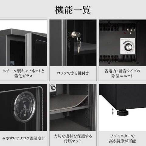 ディスプレイしながら湿気やホコリからカメラを守る電子制御式防湿庫です。
