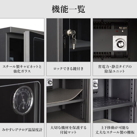 ディスプレイしながら湿気やホコリからカメラを守る電子制御式防湿庫です。