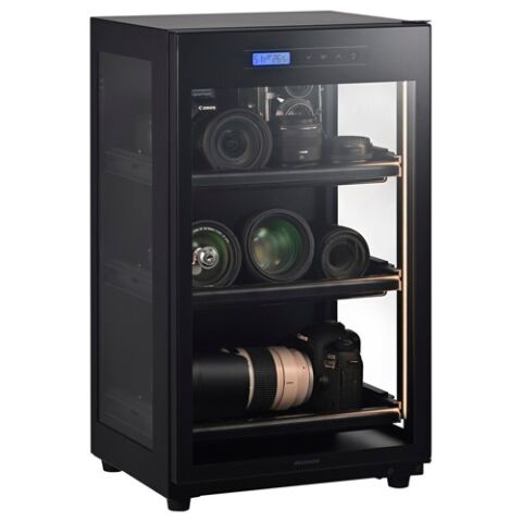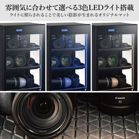 従来の防湿庫に比べて庫内が格段に明るく見やすくなり、まるでショーケースのように自慢のカメラコレクションを美しくディスプレイできます。