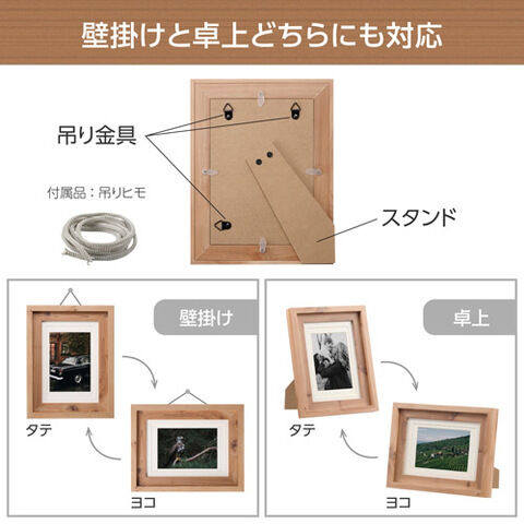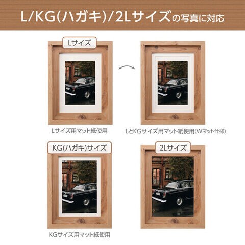 2Lサイズの写真の他に、付属のマット紙(中額)を使うことで、LサイズやKG(ハガキ)サイズの写真も飾れます。