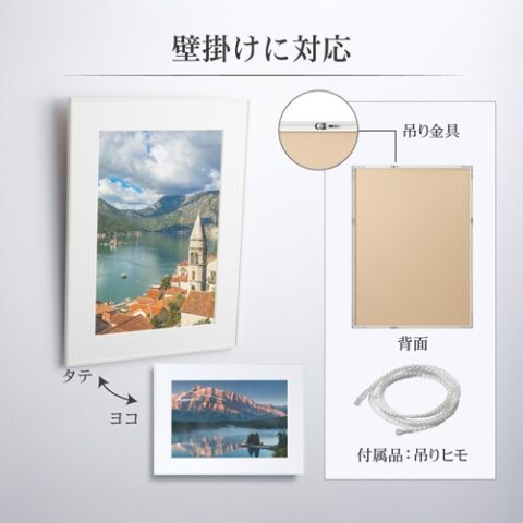 付属品の吊りヒモと裏面の吊り金具を使用して壁掛けでの使用が可能です。
