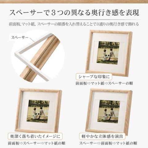 前面板 → スペーサー → マット紙 → 写真の順に配置することで、写真がフレームの奥に収まり、落ち着いた印象になります。