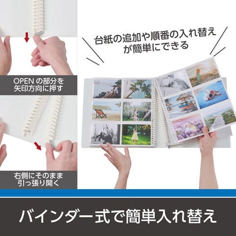 また、別売りのLサイズ用替台紙を追加して収納枚数を増やしたり、Lサイズだけではなく2Lや4切、ポストカードサイズ用の替台紙を追加することで、