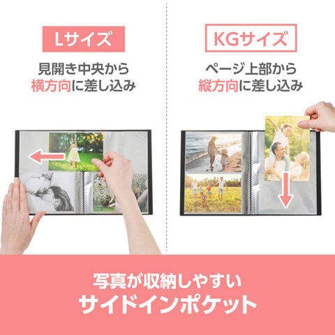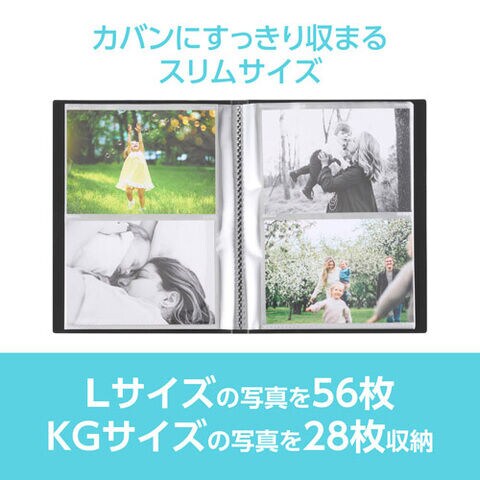 Lサイズの写真を横向きに56枚、またはKGサイズの写真を縦向きに28枚収納できます。