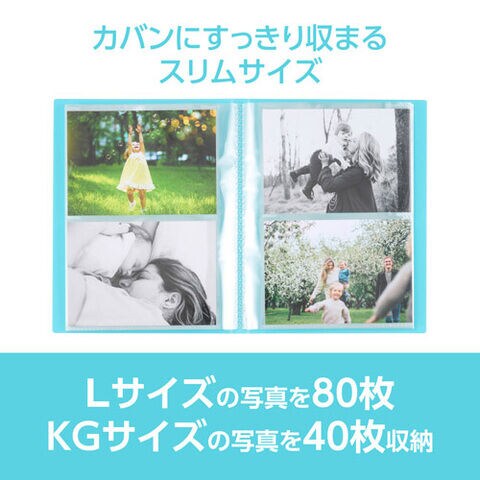 Lサイズの写真を横向きに80枚、またはKGサイズの写真を縦向きに40枚収納できます。