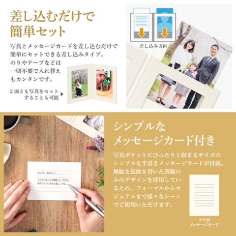 写真とメッセージカードを差し込むだけで簡単にセットできる差し込みタイプ。