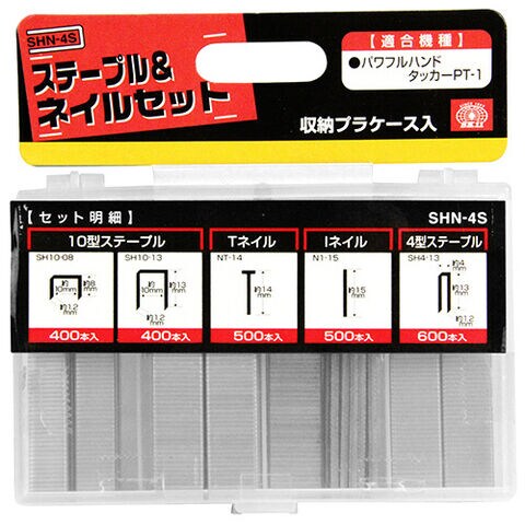 - セット内容:10型ステープルSH10-08・SH10-13(各400本)・TネイルNT-14(500本)・IネイルNI-15(500本)・4型ステープルSH4-13(600本)