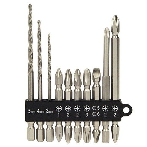 • セット内容:ビット(+1X65mm・+2X65mm(2本)・+3X65mm・+2X110mm・-5-6X65mm・+2X100mm(段付))・下穴用ドリル(3・4・5mm)