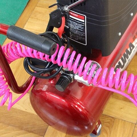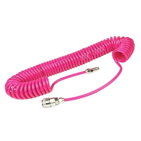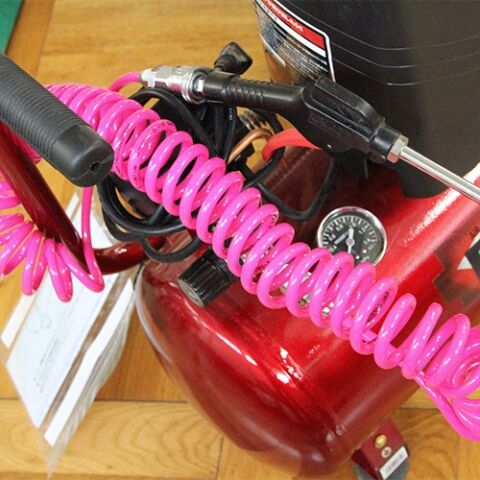 ◆伸ばして作業ができ、縮めて収納できる伸縮で邪魔にならないコイル状のエアホースです。