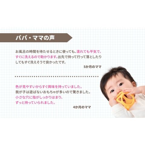 持ちやすさと舐めやすさにこだわった、 赤ちゃんが夢中になるおもちゃです。