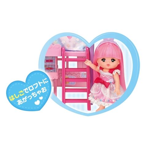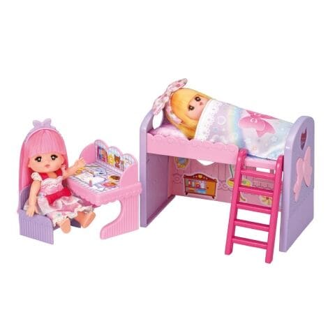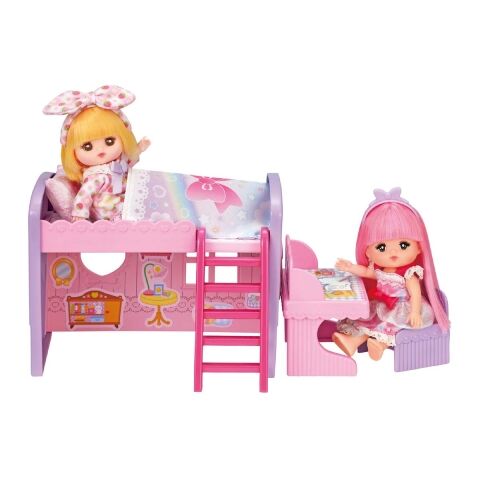 デスクでおべんきょうしたり、かわいいおふとんとまくらをベッドにセットしておねんねしたりしてメルちゃんといっしょにあそびましょ。