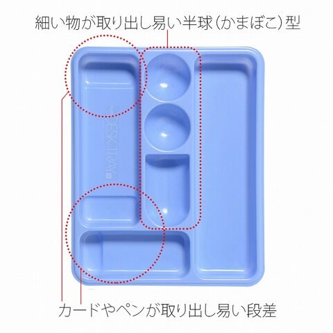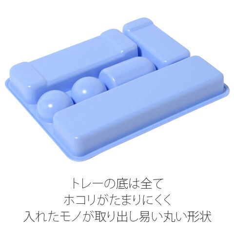 ◆半球形部分はクリップなどの細かいモノに。円筒形部分は印鑑や鍵などに。長方形+段差部分は筆記具などに(段差を利用して取り出すとスムーズです)。