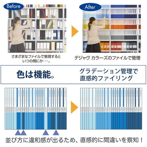 ◆「DEJA VU COLORS」が提唱する<グラデーション管理>とは、色を機能と捉え、文字情報に頼らずに、直感的に書類を管理する考え方です。ファイルの色が欠けたり、並び順が入れ替わったりすると、違和感を持ち、自然と元の位置に戻そうとします。色で管理ができるデジャヴ カラーズシリーズはこれまでのファイル整理方法を変える、効率的で簡単なファイリングをご提案します。