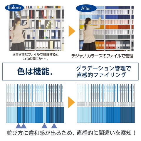 ◆「DEJA VU COLORS」が提唱する<グラデーション管理>とは、色を機能と捉え、文字情報に頼らずに、直感的に書類を管理する考え方です。ファイルの色が欠けたり、並び順が入れ替わったりすると、違和感を持ち、自然と元の位置に戻そうとします。