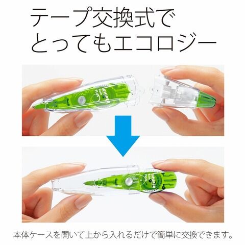 ◆テープ交換式でエコロジー。本体ケースを開いて上からリフィールを入れるだけで簡単に交換できます。