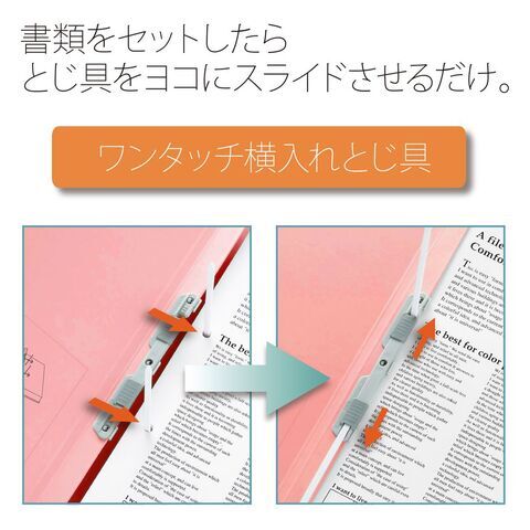 ◆書類の出し入れが簡単な横入れ式とじ具! 書類をセットしたらとじ具を横にスライドさせるだけ。