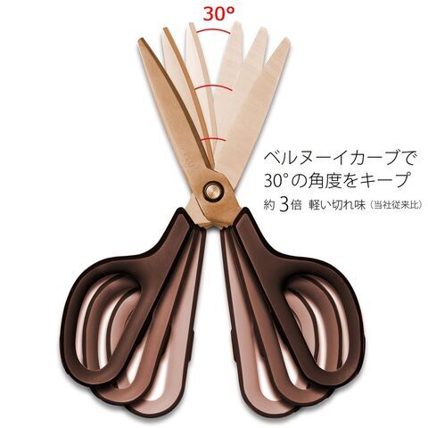 カーブ形状の刃が対象物をしっかりとつかまえるための最適な刃角度をキープし、刃の根元から刃先まで軽くなめらかな切れ味を実現。また、紙との摩擦も少なく曲線も切りやすい高角度仕上刃を採用しています。