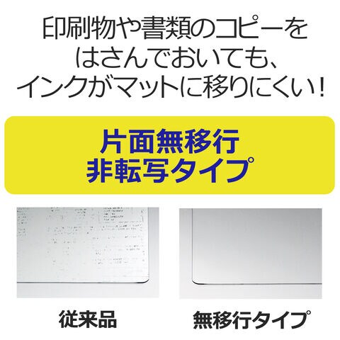 ◆片面無移行(非転写)なので、印刷物や書類のコピーを長期間はさんでおいても、インクがマット面に移りにくい加工を施したデスクマット。キレイにご使用いただけます。
